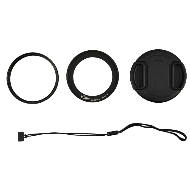 The Kiwi KWF-P600 Adapter Ring Kit is the perfect expansion for the Nikon Coolpix P600 and B700 Compact Camera. This camera is not designed to be able to attach lens accessories such as filters or a lens hood, but this four-part Kiwi kit, consisting of a LA-62P600 Lens Adapter Ring, 62mm UV filter, lens cap and lens-cap keeper makes this possible . The special design and smooth finish of the inner ring of the lens adapter protects your camera against scratches during confirmation.