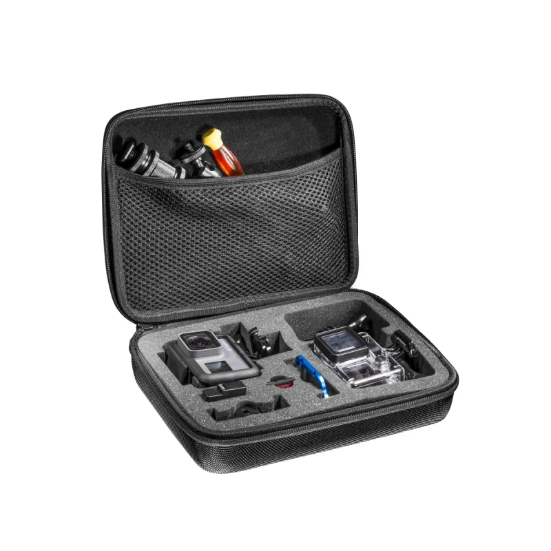 Special featuresThe robust and compact EVA hard-case with a washable nylon mesh outer shell and pre-punched foam inlay offer maximum protection. Slight shocks are cushioned and the individual pieces of GoPro equipment are securely and gently held in place with padding. The foam inlay can be adjusted for different kinds of equipment.