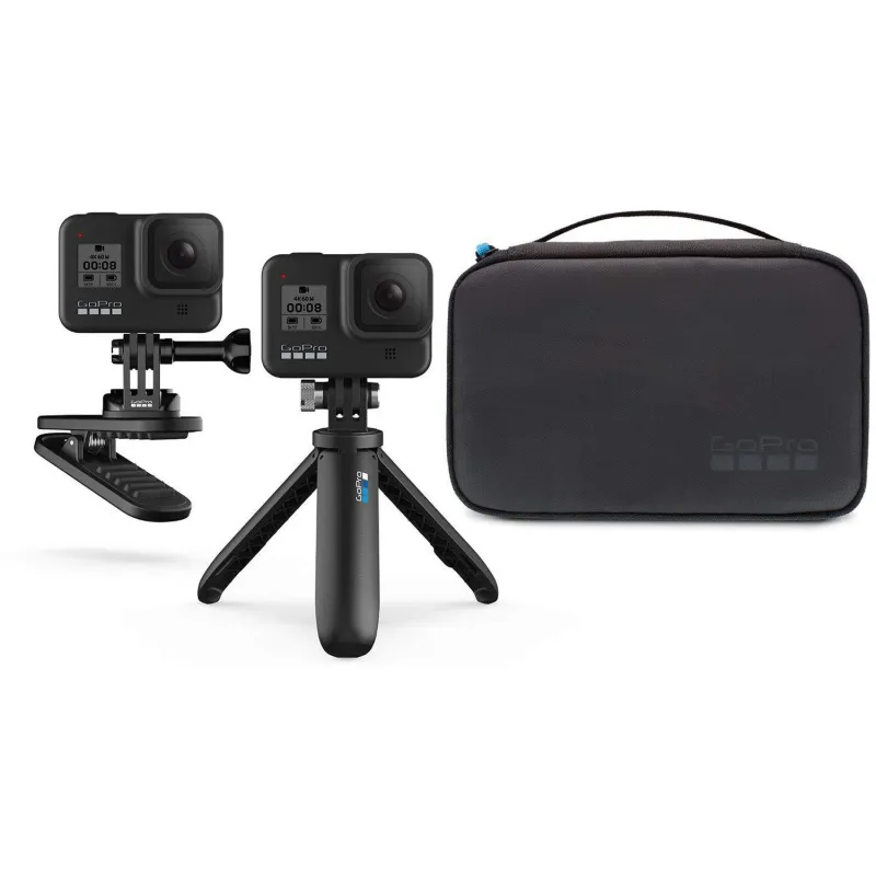The GoPro Travel Kit features the GoPro Shorty mini tripod extension pole and the Magnetic Swivel Clip, which lets you attach the HERO10, HERO11, and most HERO cameras, and the GoPro MAX to a backpack strap, belt, table edge, or other surfaces. The kit also includes a compact carry case that fits these accessories and your camera.