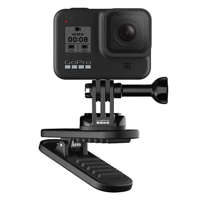 Use this Magnetic Swivel Clip from GoPro to clip your GoPro HERO or MAX camera to your clothing, strap, table, or just about any surface. The clip features a heavy-duty spring-loaded clamp to securely connect to a surface, and the exterior of the clip features a magnetic surface to connect your camera. The camera connects to the magnetic mounting buckle and secures with a thumbscrew, and it allows you to swivel the camera 360°.