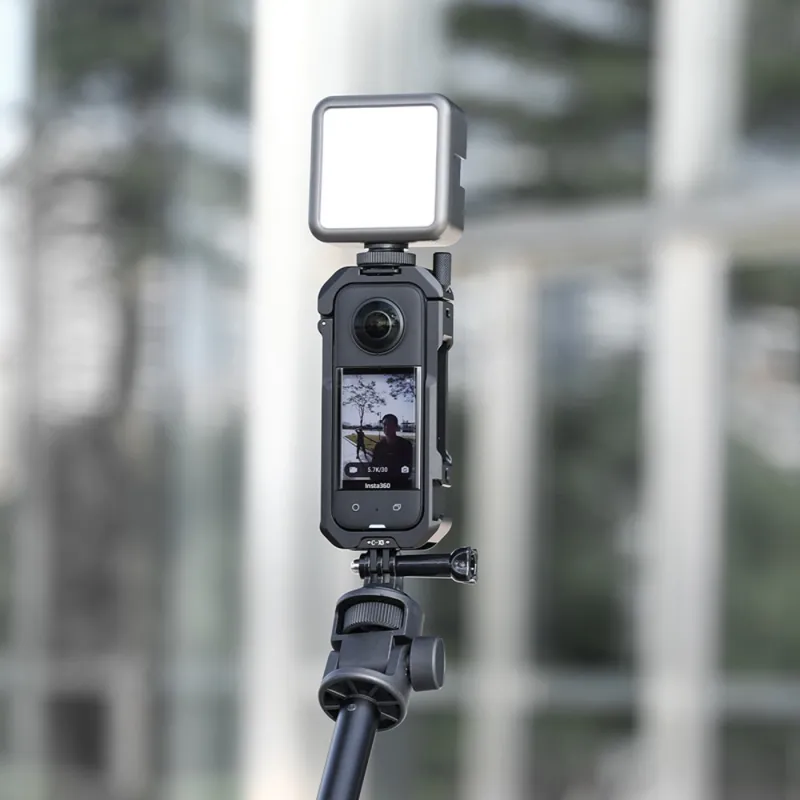 The Ulanzi C X3 Metal Cage for Insta360 X3 is a fully enclosed structure, designed as one piece. With manual locking featuring a built-in button, its sturdy and wont loosen. It includes a cold shoe attachment and 1/4 20 screw holes for attaching accessories like microphones and lights. The built-in rubber gasket ensures excellent protection.
