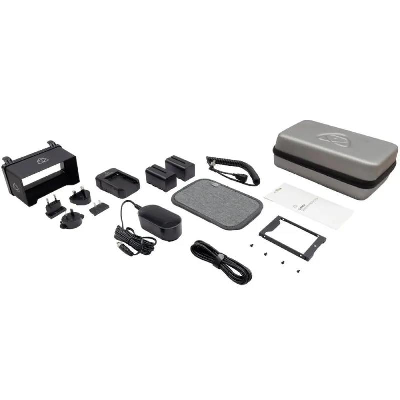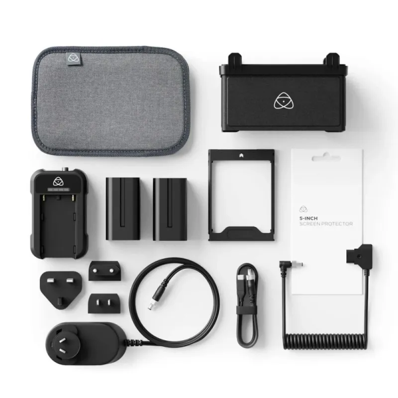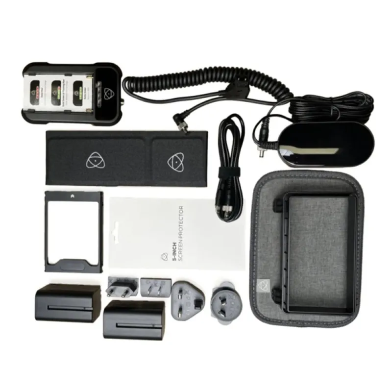 The Atomos 5 accessory kit for the Ninja and SHINOBI features a sunhood, screen protector, DC Cable, Quick Charger, two NP-F750 5200 mAh batteries, and an EVA case.