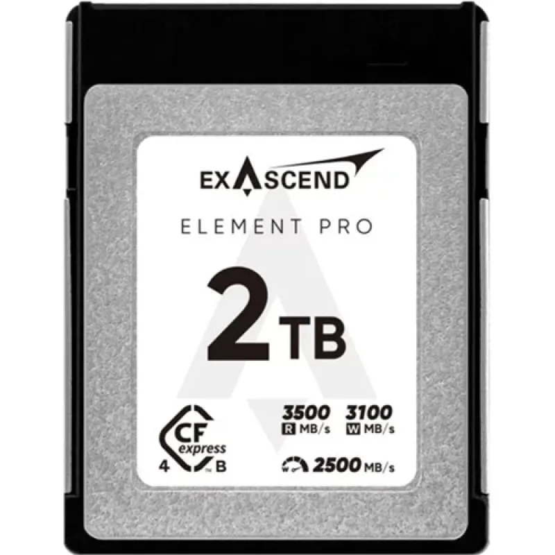 The Exascend CFexpress 4.0 Type B Element Pro Series 2TB memory card is designed for professional filmmakers and photographers, offering high capacity and speed. Utilizing PCIe 4.0 / NVMe 1.4 technology, it achieves read speeds of up to 3500 MB/s and write speeds of 3100 MB/s, making it perfect for capturing 8K and 12K video at 120 fps. Its rugged design ensures durability, being dust, weather, impact, X-ray, and magnet-resistant.
