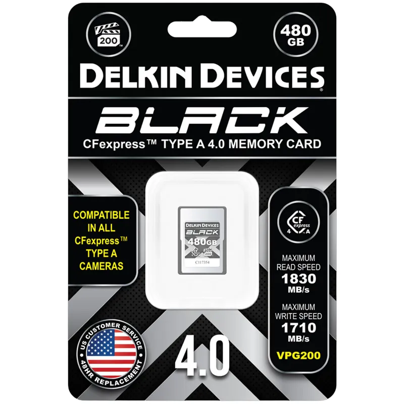 Combining strength, reliability, and performance, the 480GB BLACK CFexpress Type A 4.0 Memory Card from Delkin Devices features a storage capacity of 480GB and is designed for professional photographers, videographers, and high-end cinematic hosts. It is well-suited for raw and continuous burst photography as well as raw 8K, 6K, and 4K video at high bitrates and frame rates.