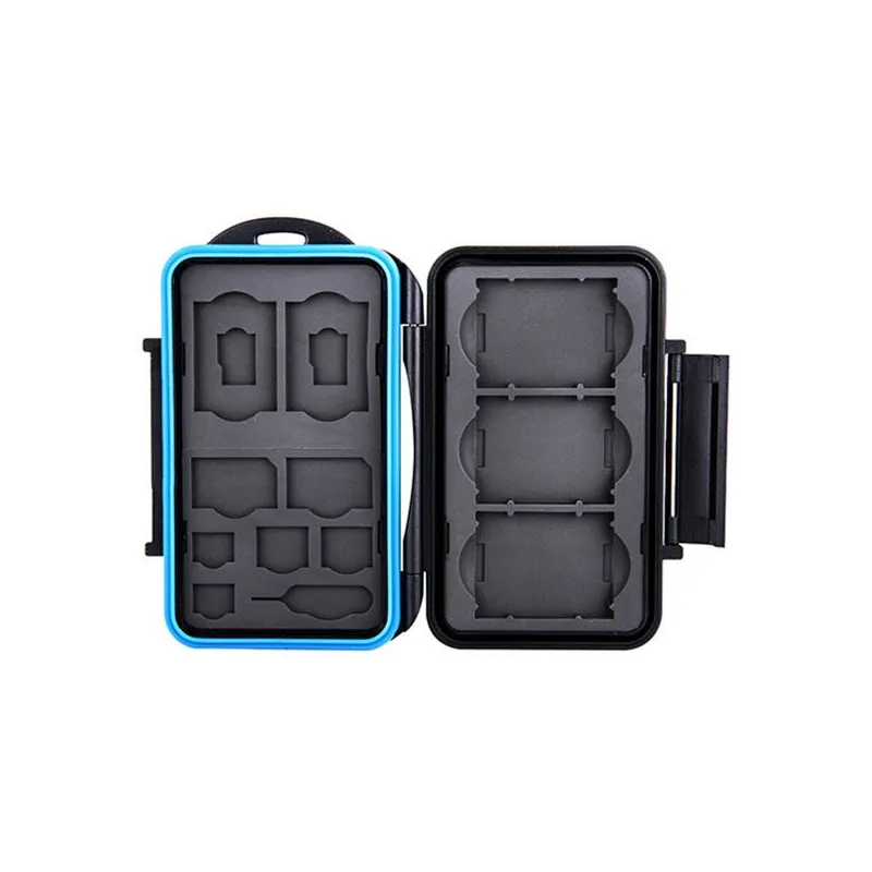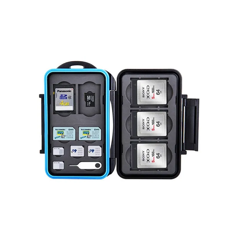 The JJC MC-STMQ13 Memory Card Case is a strong and splash-proof storage box for three XQD memory cards or CFexpress Type B, two SD memory cards, two micro SD memory cards, two SIM cards, two micro SIM cards and two nano SIM cards. The molded rubber interior absorbs any shocks and SIM cards stay in position if you put the Memory Card Case in a bag or pocket. Your valuable cards are also well protected from dust and other dirt. The ergonomic locking system is easy to open and close again.