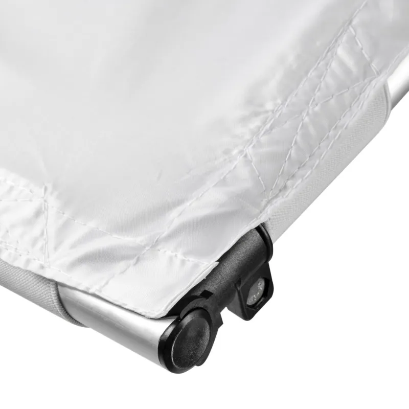 The white diffuser is equipped with Velcro and the black/silver cover with elastic bands in the corners. That way a quick swap of the reflector cover is possible. Due to the Velcro and the elastic bands, the cover is close-fitting and wrinkling is kept to a minimum.