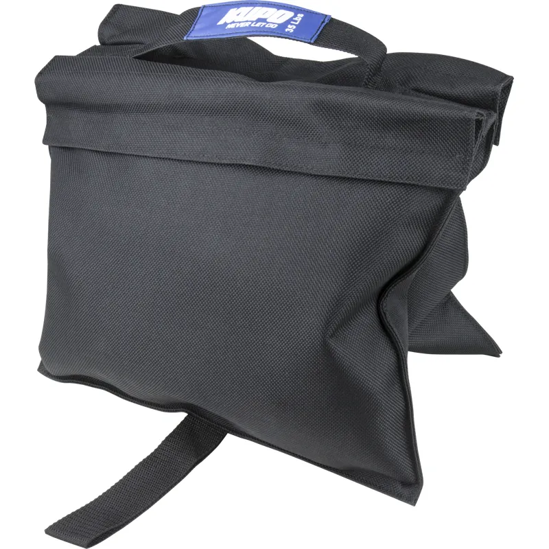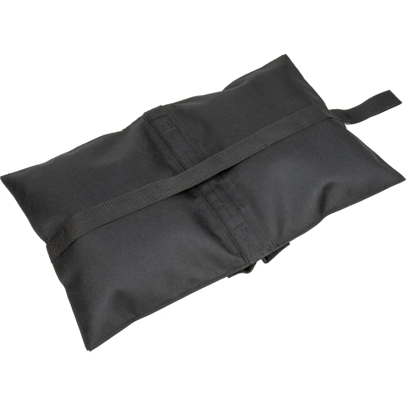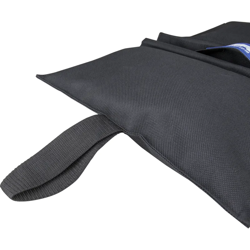 This sand bag features a reinforced handle sewn into both sides of the bag using a box and cross pattern. Additionally, a flyaway handle is equipped, allowing you to drape it over light stand legs. The loading weight is indicated on the blue label for easy identification. This is a large bag with butterfly lift handles.