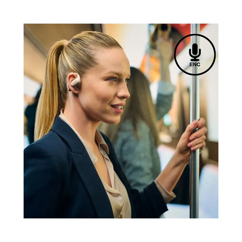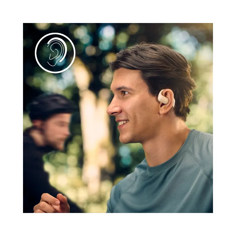 RB-F10 Earphones are compact and designed for all-day comfort, allowing you to stay aware of your surroundings. They fit over the ears, similar to glasses, ensuring you can hear important sounds while enjoying your audio. With the latest Bluetooth technology, they offer quick connections, clear calls, and all-day battery life.