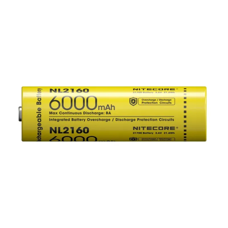 The Nitecore NL2160 (6000mAh) 21700 is a rechargeable battery with an impressive capacity of 6000mAh and an output voltage of 3.6V, suitable for various applications. With a maximum discharge current of 8A, this battery works well with higher-powered devices such as Nitecore torches that can produce up to 1800 lumens.
