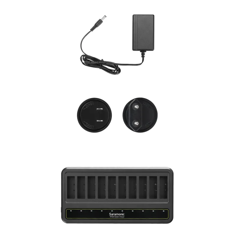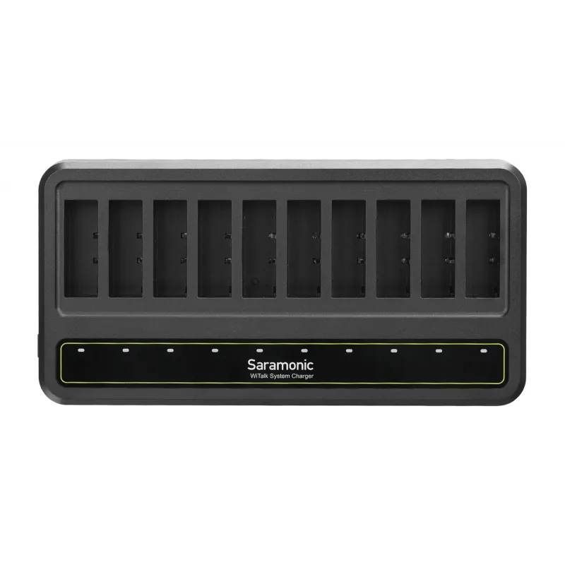 The Saramonic 10-channel charger for WiTalk-BP batteries provides fast and efficient charging. With it, you will always be better prepared for extended runtime or unforeseen events. All cells can be charged simultaneously with the same power, saving you a lot of time and helping to better organize your workplace. An LED light will inform you about the charging status. Included is a power adapter and an adapter that allows you to use EU and US sockets (plug types A and C).