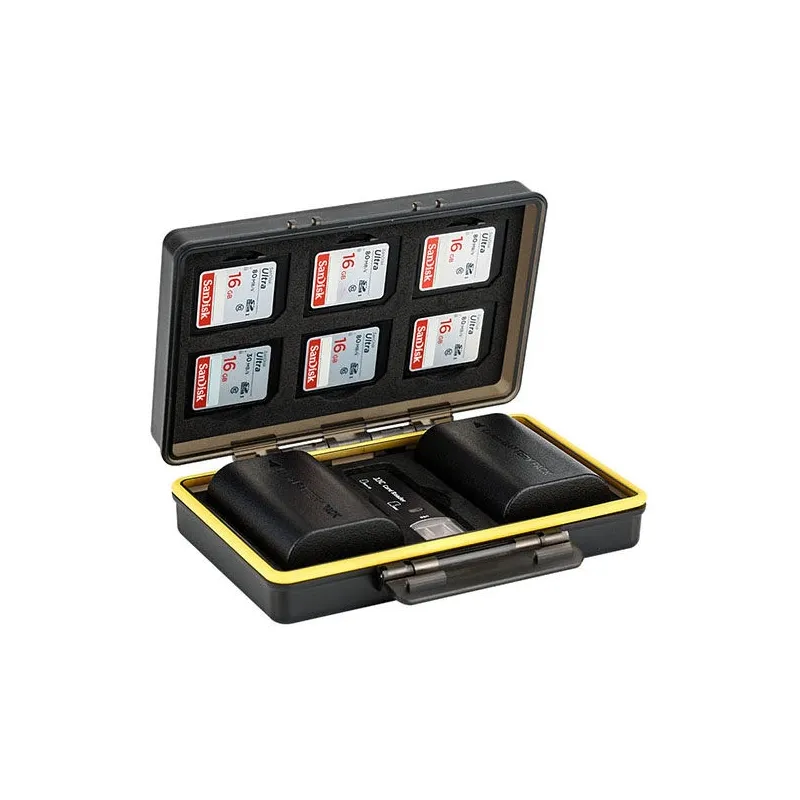 This case is suitable for Canon LP-E6, LP-E6N and JJC B-LPE6 batteries and not only provides protection, but also prevents short-circuiting due to friction. The soft cotton interior gives your battery and memory cards optimal protection. Thanks to the water-resistant seal, moisture and dirt have no chance of entering the case. The case is also lightweight and easy to carry.