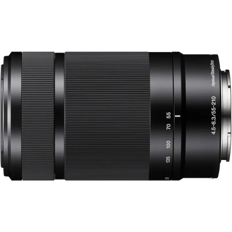 The black E 55-210mm f/4.5-6.3 OSS E-Mount Lens from Sony features extra-low dispersion glass, a broad zoom range and aluminum alloy construction. On an APS-C camera, this zoom lens has a 82.5-315mm focal length range, suitable for event photography and portraiture alike. Internal focusing and linear motor-driven AF system help create responsive yet quiet focus while minimizing mechanical noise. Additionally, a separate manual focusing ring capable of Direct Manual Focus allows seamless transitions from AF to manual focusing.