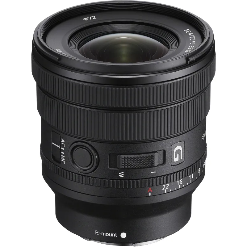 The Sony PZ 16-35mm f/4 G lens features a compact design and excellent optics, making it perfect for video and still photography. Its lightweight build and constant f/4 aperture provide versatility for various shooting conditions.