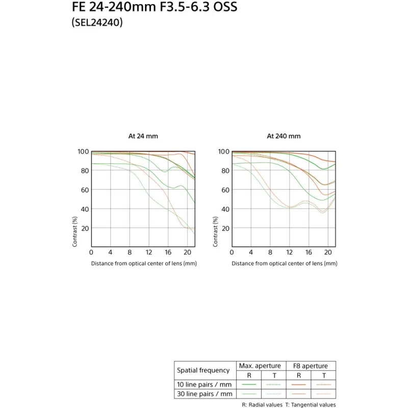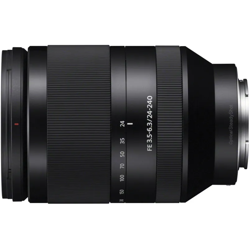 The FE 24-240mm f/3.5-6.3 OSS Lens from Sony is a full-frame compatible E-Mount telephoto zoom lens with the versatility to stretch from true wide-angle to super telephoto perspectives. Its advanced optical design includes 5 aspherical elements and 1 ED glass element, achieving high-quality performance with reduced chromatic and spherical aberrations in a compact design. Optical SteadyShot image stabilization facilitates sharper imaging in low light situations and when shooting at long telephoto lengths.