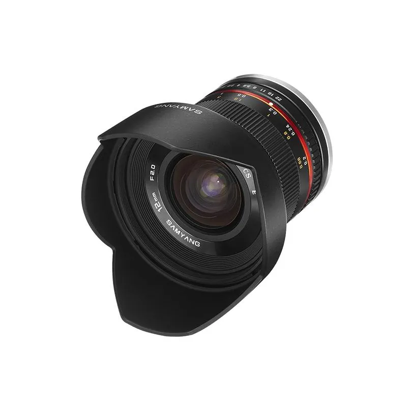 Samyang 12mm F2.0 NCS CS gives wide angle of view amounting to 98.9 degree and rectilinear image mapping function. Owing to a large aperture range of f/2.0, the lens can be a useful shooting device and offer high image quality even in poor lightning conditions. Optical construction of the lens comprises 12 elements divided into 10 groups, these components include one aspherical lens (ASP) and one hybrid aspherical lens (H-ASP). There are also three lenses made of ED glass with extremely low dispersion factor. Technologically, 12mm NCS CS lens is the most advanced device branded with Samyang logo.