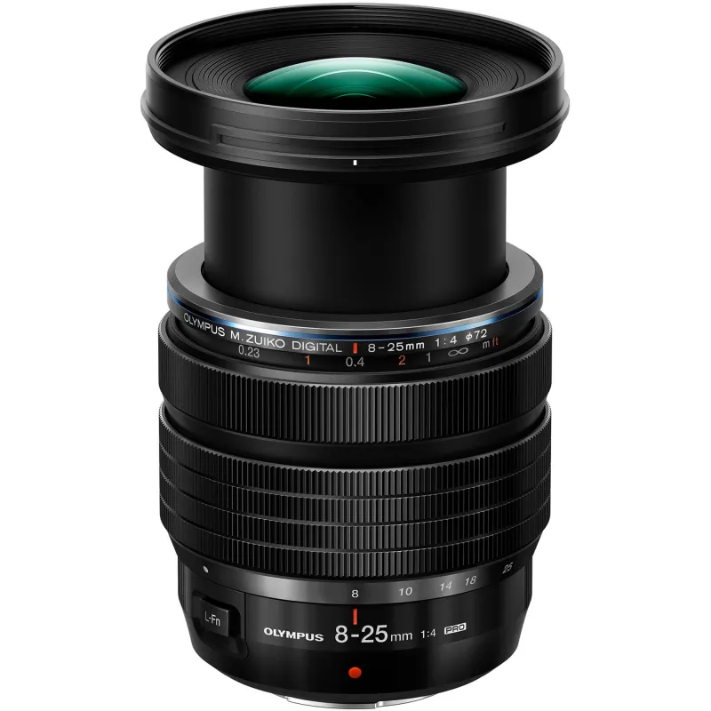 The Olympus M.Zuiko Digital ED 8-25mm f/4 PRO is an ultra-wide Micro Four Thirds zoom lens, equivalent to a 16-50mm full-frame format. Its advanced optical design minimizes chromatic and spherical aberrations, ensuring clarity and color accuracy. Key features include: