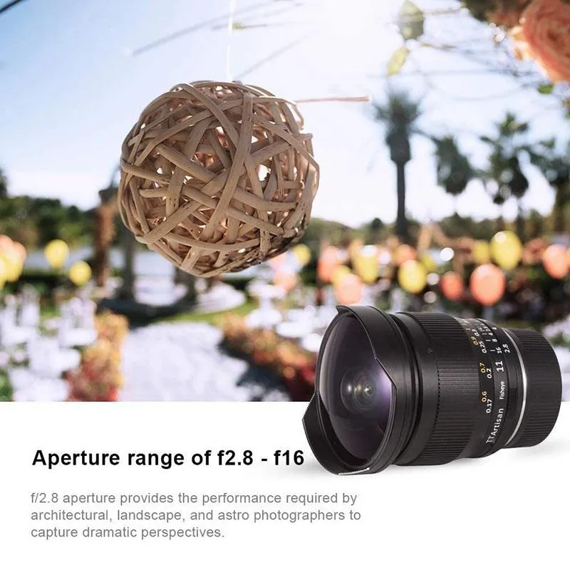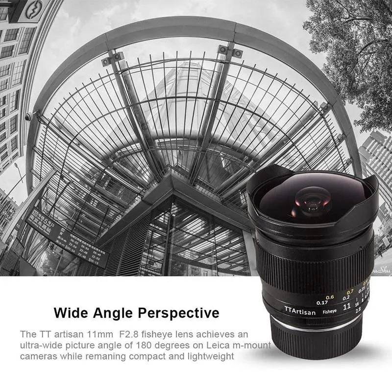 Ttartisan 11mm f/2.8 is a fish eye lens. It offers an extremely wide viewing angle, thanks to which the photographers work can be even more creative! The lens is intended for cameras with Canon EOS-R mounting. The maximum aperture hole F2.8 increases the possibility of working in difficult lighting conditions. Extended shots and surreal showing of the image can open new inspirations for sports and landscape photography. The minimum sharpening distance is 17cm! The most important features of the TTARTISAN 11MM F2.8 Canon EOS-R lens: Fish Oko manual lens designed for camera with Canon EOS-R. 180 degree viewing angle for full frames, optical system - 11 elements in 7 groups Aperture range F2.8 - F16 Effectively Construction: aluminum body with anodized color pattern; The lens has many brass elements, compact and light: 439 g