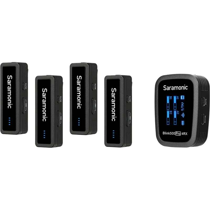 The Blink500 Pro B8 provides out-of-the-box operability for content creators. The components are paired at the factory, so you can start working immediately. The easy-to-read OLED screen on the receiver makes any necessary adjustments quick and intuitive. The system automatically hops to free channels to avoid static noise and dropouts, delivering reliable wireless audio at a distance up to 164 feet. Built-in rechargeable batteries provide up to 4 hours of operation for the transmitters and 8 hours for the receiver. Provided are a 3.5mm TRRS cable for connecting to a smartphone/tablet and a 3.5mm TRS cable for use with cameras and other 3.5mm-input devices. 4-channel audio output is supported with an optional cable (available separately).