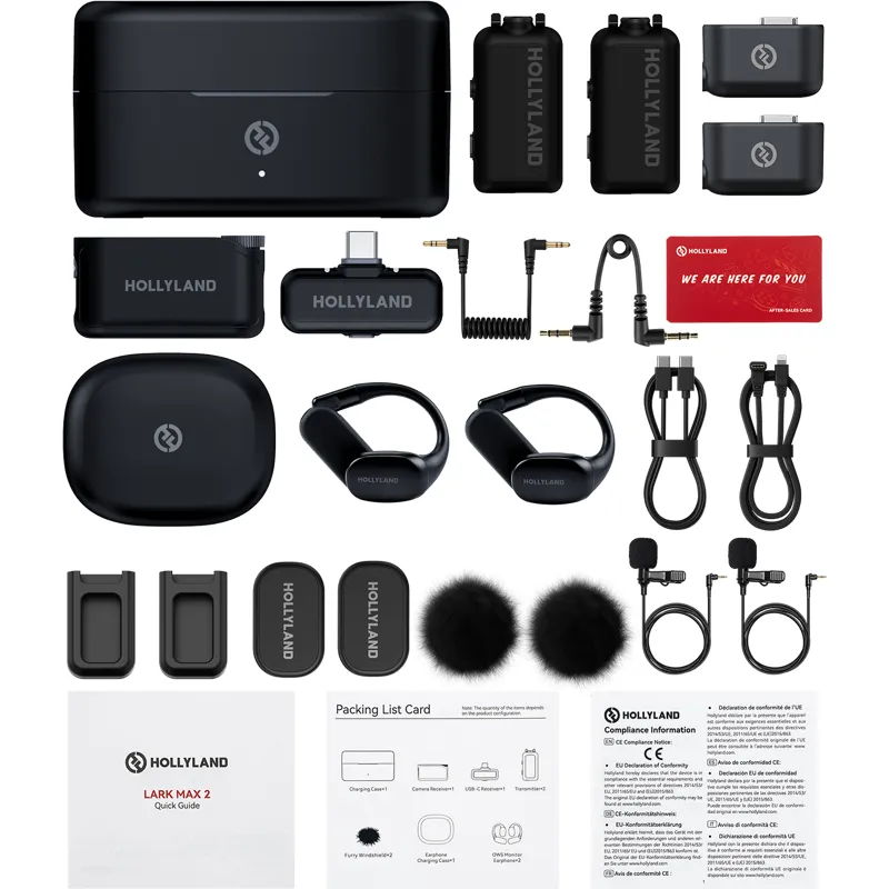 The Hollyland LARK MAX 2 Ultimate Combo is a feature-packed, user-friendly digital wireless microphone system with wireless monitoring designed for videographers, podcasters, streamers, and content creators. It allows you to capture two on-camera voices with broadcast-quality sound straight out of the box, recording directly to cameras or USB-C/Lightning mobile devices. Delivering crystal-clear 32-bit/48 kHz audio throughout the entire signal chain, it captures every detail from recording to transmission to monitoring.