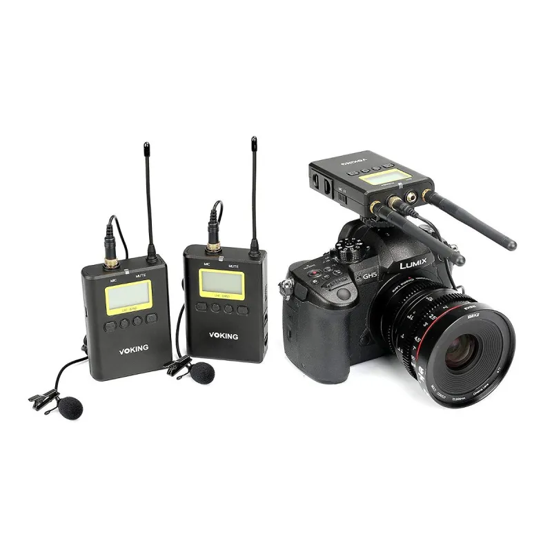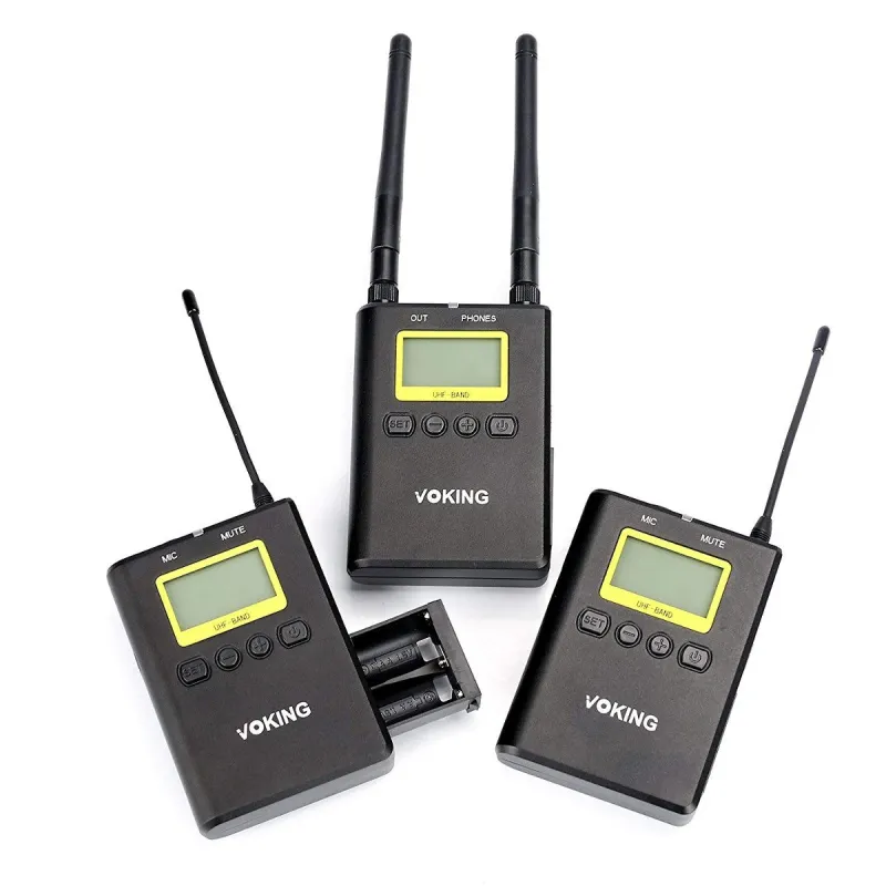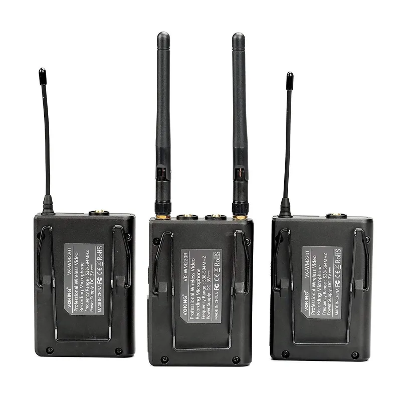The Voking VK-WM220 kit consists of two transmitters, one receiver, two lavalier microphones and corresponding accessories.