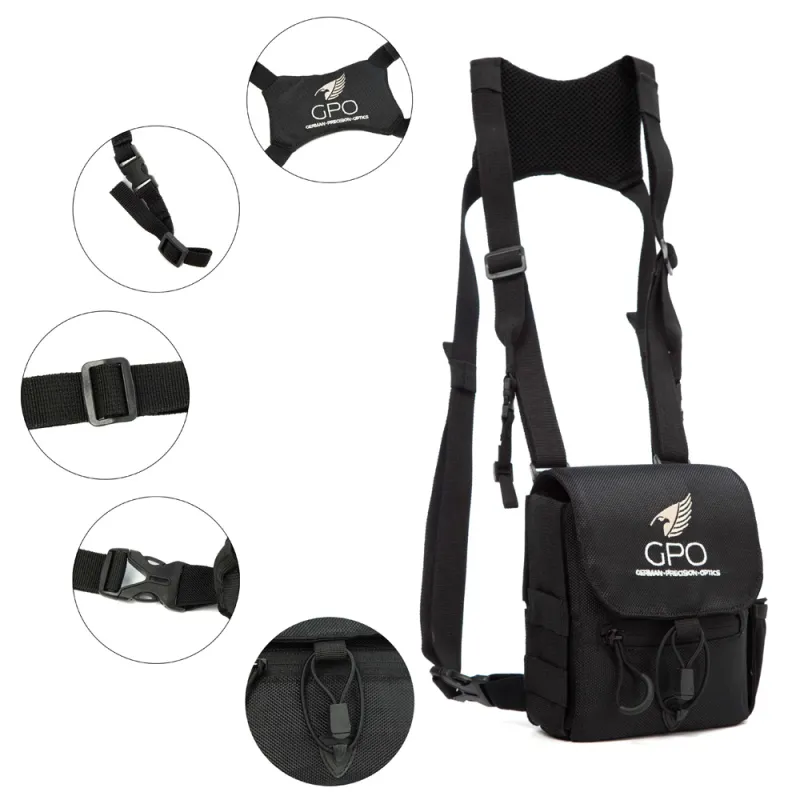 The GPO Harness with chest pocket is designed for binoculars with an eyepiece diameter of 32 mm to 50 mm. The harness prevents uncontrolled dangling of the binoculars and allows you to fully concentrate on your outdoor activity. Additional pouches and pockets are nicely placed for all extra accessoires you might need and the durable fabric protects your glass from wind and weather. The shoulder strap can be comfortably adjusted to your body size. ,