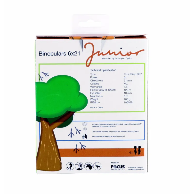 Magnification of 6x makes it easier for children to hold the binoculars steady, giving a stable image of a bird, elk, and other great experiences of nature. Anti-reflective optics for the best possible contrast and sharpness. The binoculars come with a belt bag and neck strap.