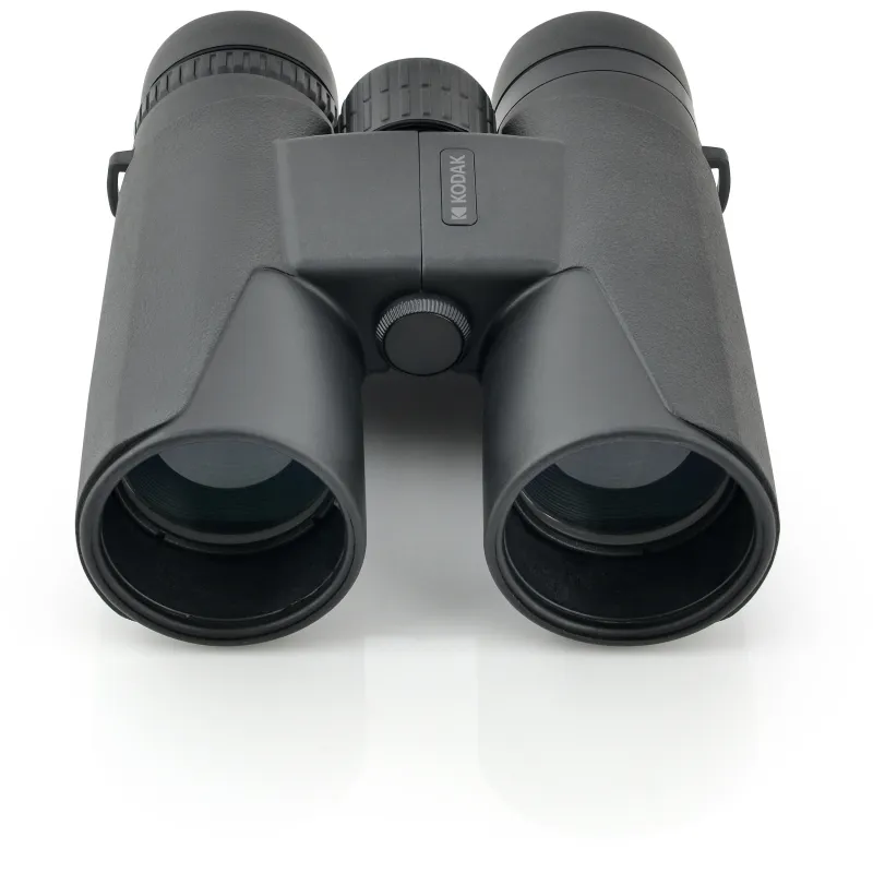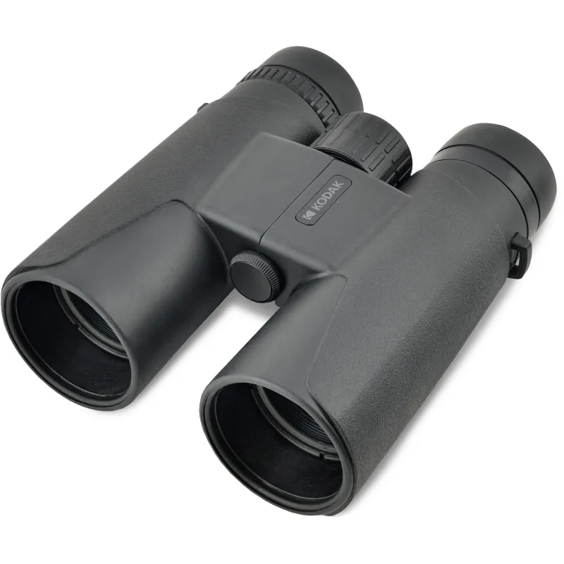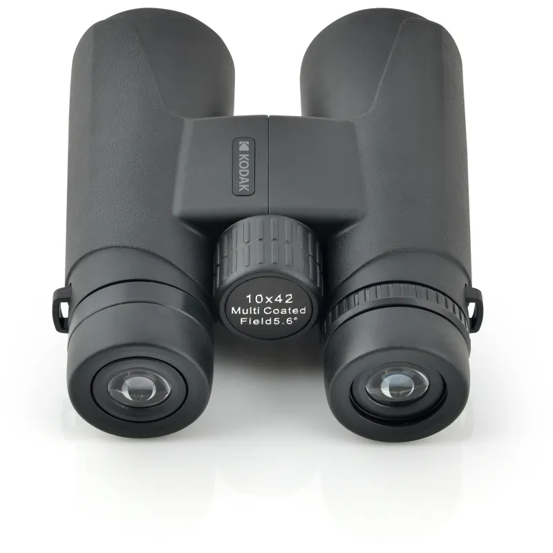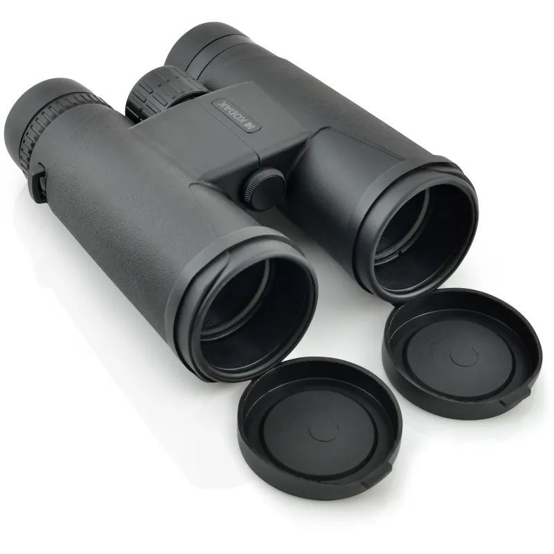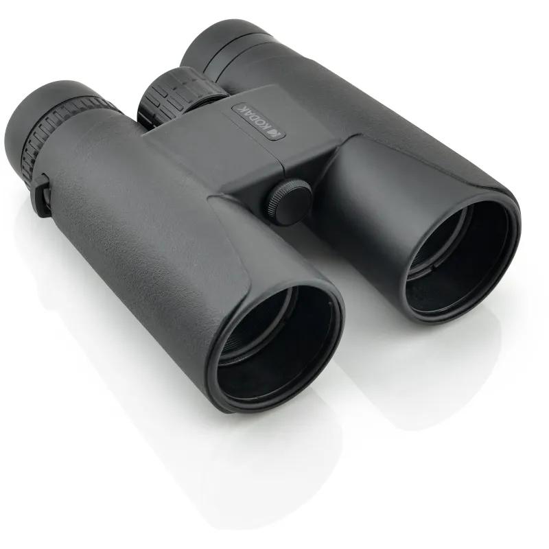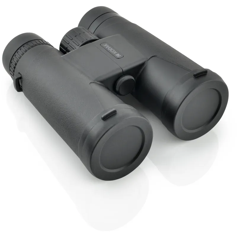 KODAK BCS800 binoculars deliver exceptional viewing quality with 10x magnification and 42mm lenses for bright images. The special lens coating minimizes internal reflections and chromatic aberrations, enhancing image clarity and reducing eye strain. They feature sliding rubber eyecups for comfort, protective lens caps, and a carrying case for easy transport.