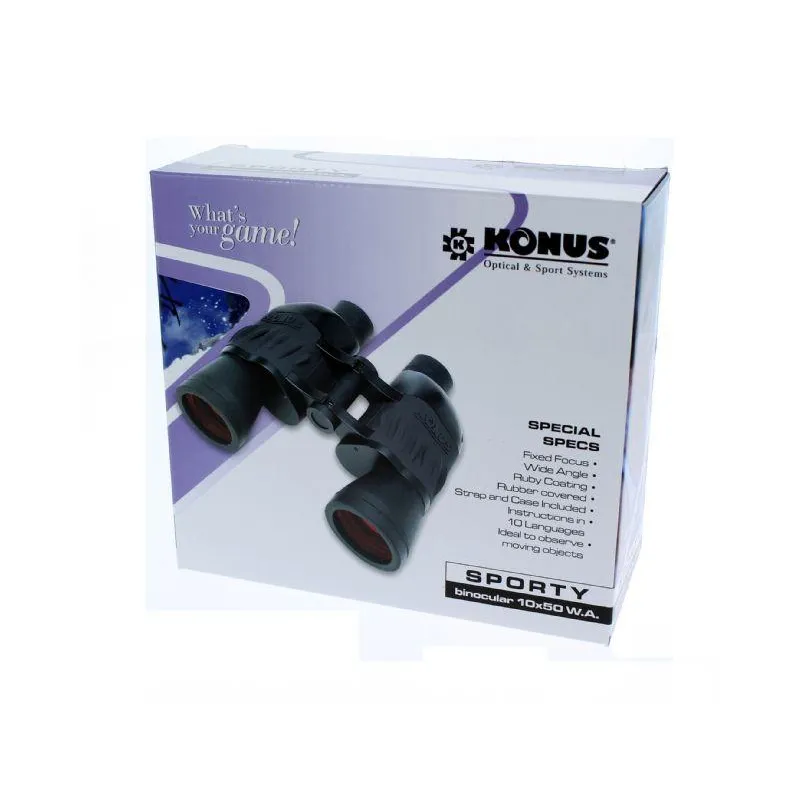 The Konus Sporty 10x50 WA is versatile and always ready for use. The Konus Sporty is great when it comes to quickly catching a moving subject. Because of the Fix Focus you don't have to focus the binoculars and it's enough to look through the lenses. WA stands for Wide Angle and these models have a wider viewing angle than comparable models without WA.