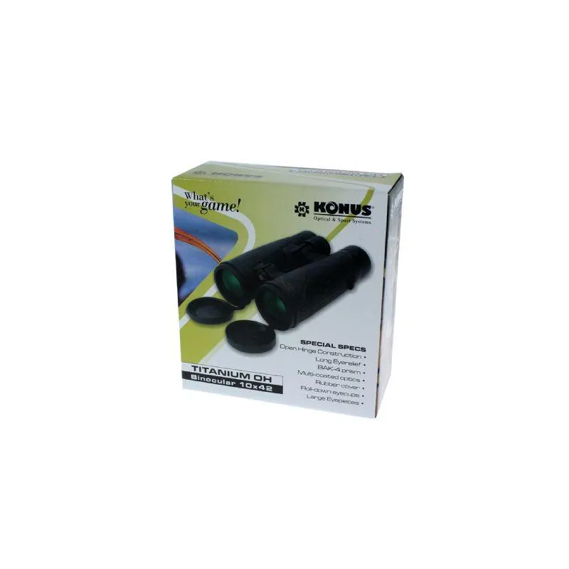 The Titanium Evo from Konus is a pair of binoculars with 10 times magnification. The aperture of 42 mm brings a large amount of light inside. Thanks to the open bridge, you can hold the Titanium Evo firmly with both hands. The rubber casing absorbs small shocks, reducing the risk of fall and impact damage. This material also provides protection during a rainstorm.