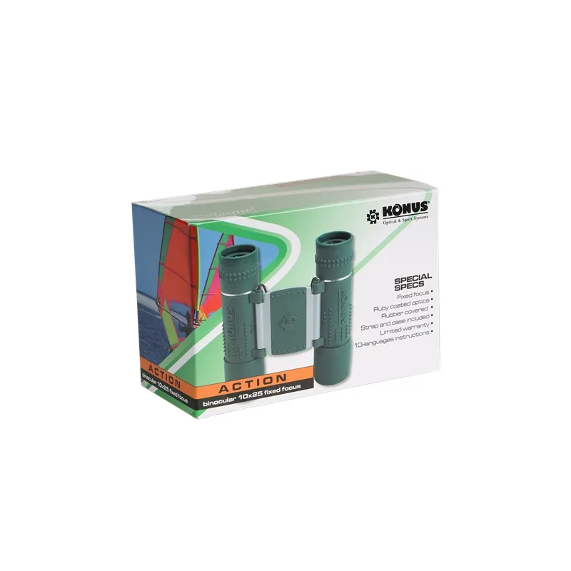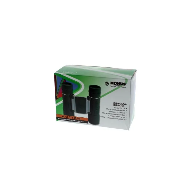 Konus Action 10x25 Fix Focus pocket binoculars make it possible to carry the power of observation anywhere. Their reduced dimensions, the optic quality and the special rubber covering, make them indispensable items for travelling, trekking, following sport events and so on.