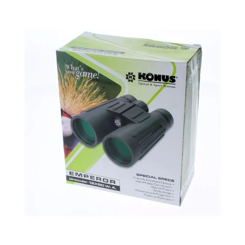 Designed and built to achieve a supreme optical quality, the Konus Emperor 12x50 WP/WA will leave you breathless with the impeccable brightness and clarity of their special BAK-4 prisms with Phase Correction. This is an advanced coating technique that will force the light beams back into phase, thus improving the image definition and contrast and creating a sharper view, especially noticeable when observing fine details. The other features of the Emperor binoculars are: waterproof and nitrogen purged body, wide angle eyepieces, extra long eye relief and twist up eyecups, along with an attractive and edgy design.