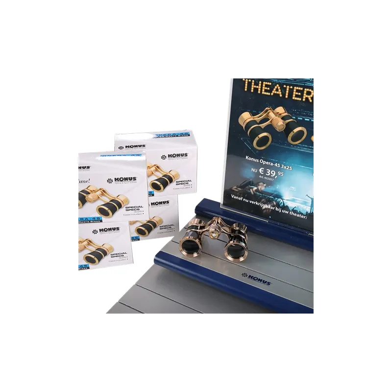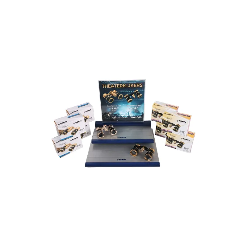 This Theaterbinocular Kit - Display with Top Card Including Theatre Binoculars should not be missing in your theatre. On this compact display you can easily present different theatre viewers to arouse the interest of your visitors. On request we can supply you with a Top Card so that it can be adapted to your wishes and corporate identity.
