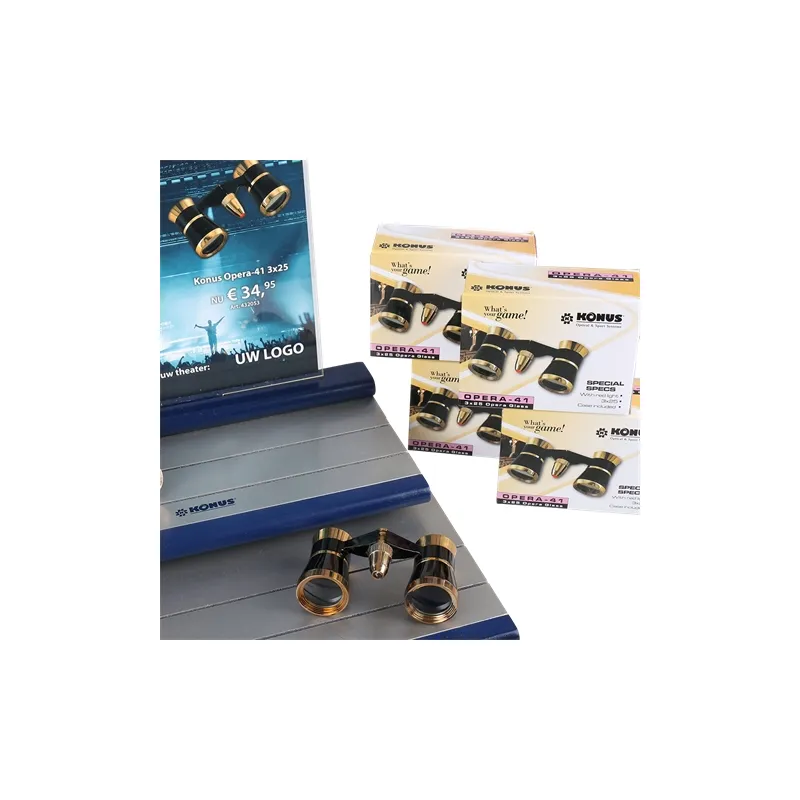 The Konus Opera-41 is equipped with a Fixed Focus where focusing is controlled by your own eyes. This way you do not have to focus by hand. This model is also equipped with a red light, which you can use, for example, to read the programme of the performance.