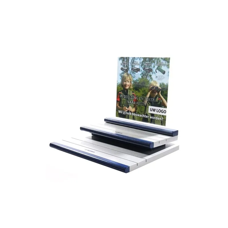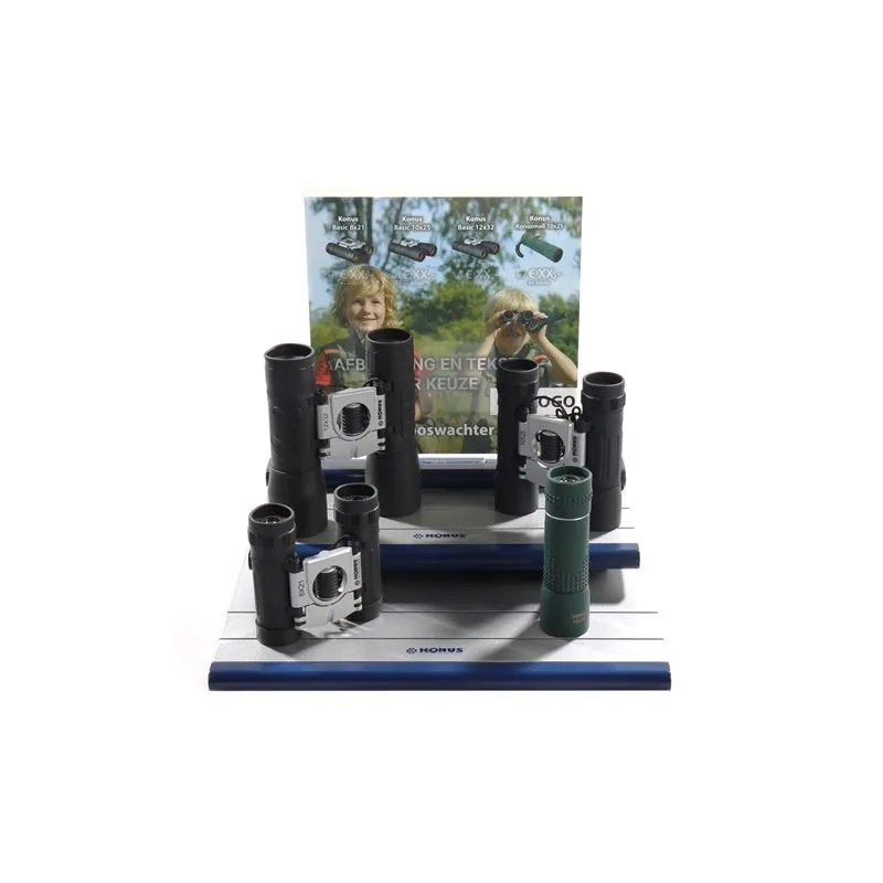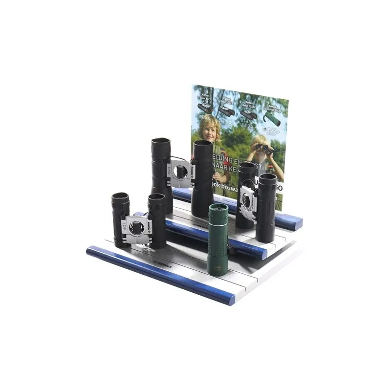 This set consists of 20 binoculars and a binocular display with personalized features. Four different binoculars are supplied, which you can mount on the binoculars display. On the display is a photo of your choice, with your own logo and your chosen sales prices. An extra low purchase price makes it possible to make a nice margin on the binoculars. After ordering we will contact you to discuss your wishes.