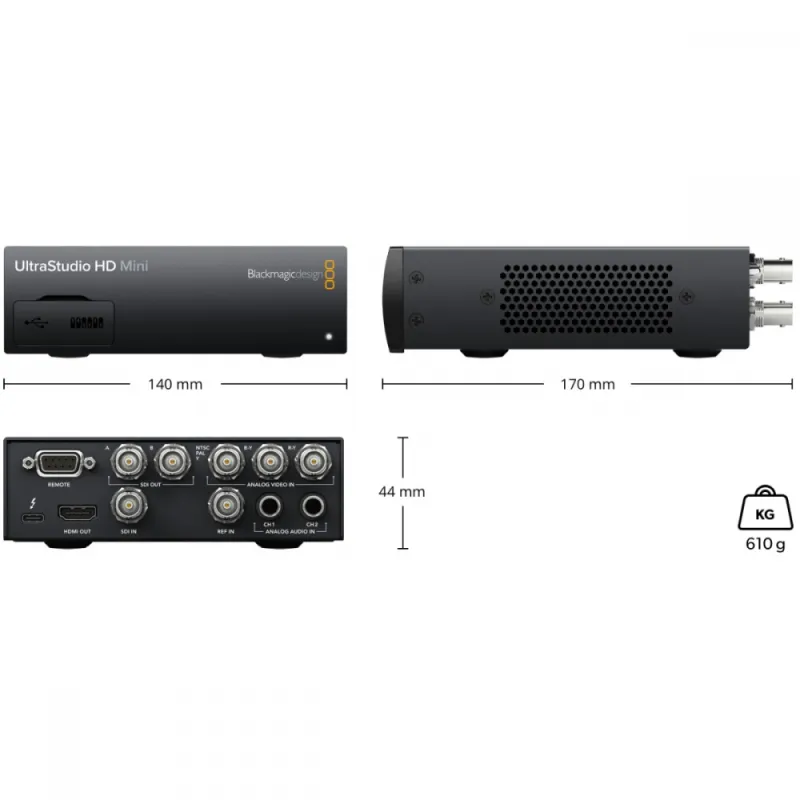 UltraStudio HD Mini includes 3G-SDI, analog YUV and composite NTSC/PAL video inputs, two channel analog audio in, and reference as well as RS-422 for deck control! For output, you get dual link 3G-SDI with simultaneous fill and key, plus HDMI. UltraStudio Mini also features Thunderbolt 3 so you get incredible 40 Gb/s performance for capture and playback of fully uncompressed video, leaving your computer’s CPU free for more processing tasks.
