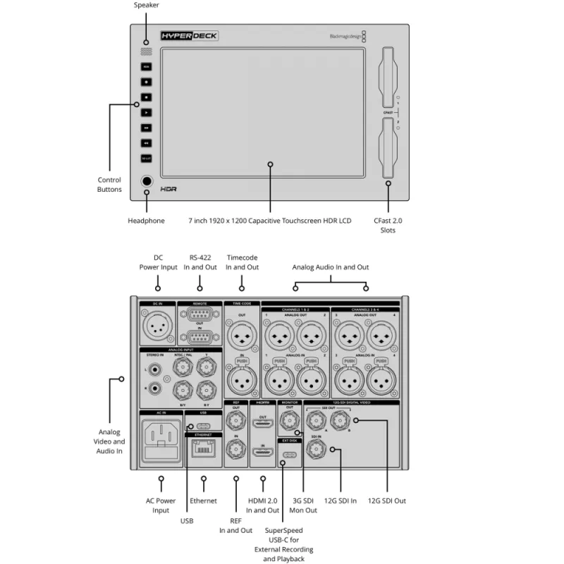 HyperDeck Extreme has an innovative touch screen user interface with deck controls as well as a large screen to view your recording. Then add a HyperDeck Extreme Control for traditional broadcast deck controls and a large shuttle knob that feels incredibly luxurious to use! You can even rack mount the HyperDeck and the controller! HyperDeck Extreme also includes 2 media slots, 12G‑SDI, analog connections for archiving, USB‑C external disk recording, plus a front panel speaker and headphone jack! There's also an optional cache that eliminates dropped frames if your media becomes full or is too slow. Both AC and DC power connections are also included for studio or on location use.
