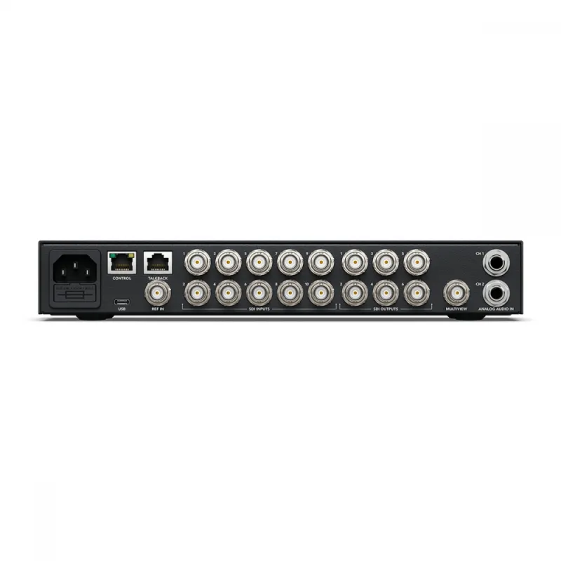 - 1x multi view configurable to 16, 13, 10, 7 or 4 up view. Includes monitoring of Program, Preview, Inputs, Media Players, DSK, Clean Feed with optional labels and audio meters