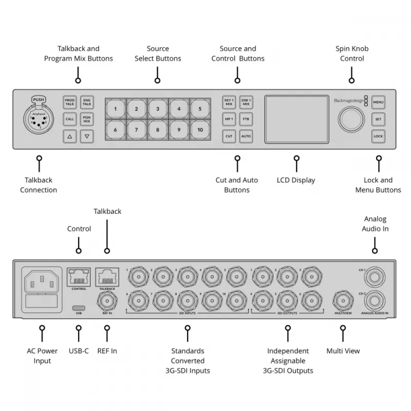 ATEM 1 M/E Constellation HD is a high definition live production switcher packed with advanced features! The single M/E design includes 10 standards converted 3G‑SDI inputs and 6 independent 3G‑SDI aux outputs! It also includes a USB webcam output, DVE, chroma keyers, media players, multiview and more!