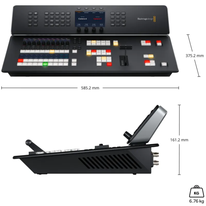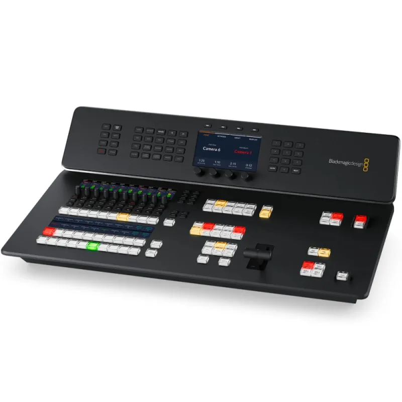 ATEM Television Studio HD8 is a compact live production switcher with a built-in broadcast control panel. It offers 8 standards converted 3G-SDI inputs, built-in streaming, master recorder, multiview, USB webcam support, DVE, 4 ATEM Advanced Chroma Keyers, media players, talkback, 4-way Ethernet switch, and optional internal cloud media storage.