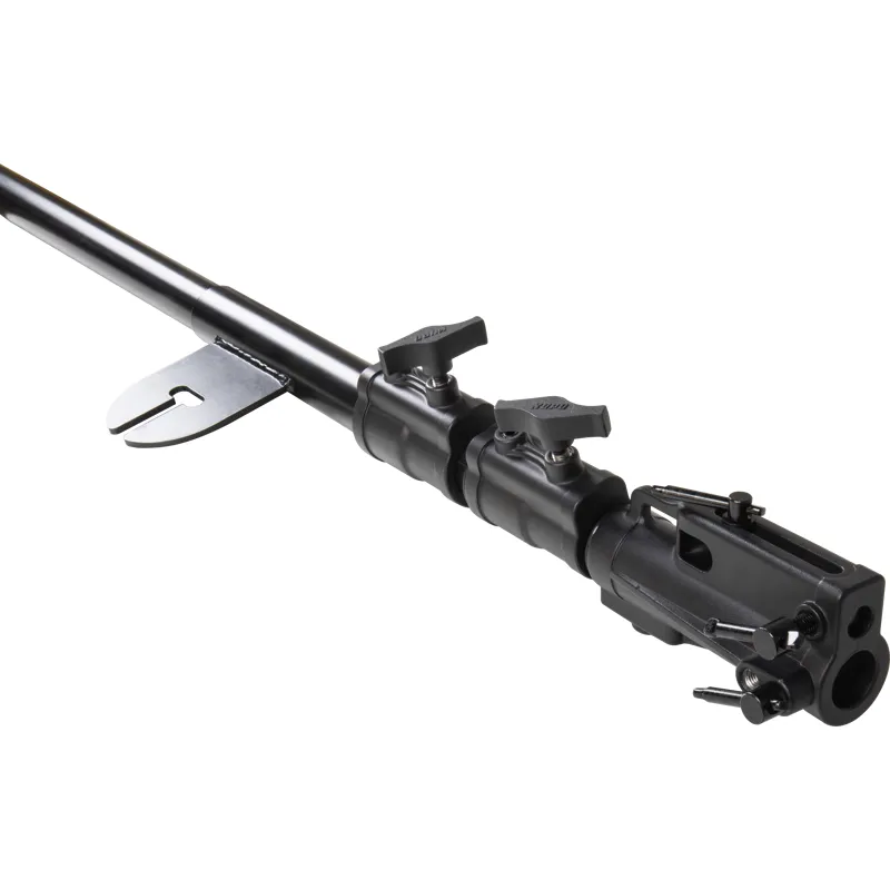 The Kupo Junior Boom Arm is made from solid steel with a black coating that can support a payload of up to 40kg when folded and up to 10kg when fully extended. The heavy-duty tilt locking device is designed to work with a 4.5 grip head, providing the ability to tightly lock the boom in place. This feature allows the boom to slide within it to adjust the balance of your load. Additionally, a heavy-duty steel hook is welded on the end of the boom for hanging counterweights.