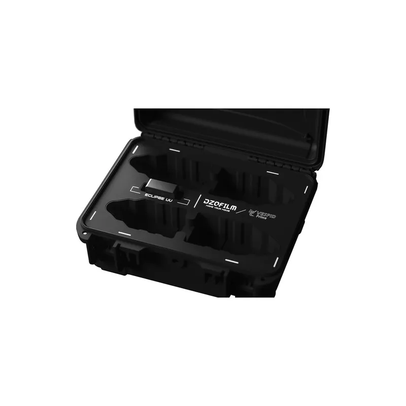 The Hard Case for VESPID Primes from DZOFilm is a hard-shell case that fits up to four VESPID prime lenses. This case interior features a laser-cut foam insert that cradles and protects each lens.