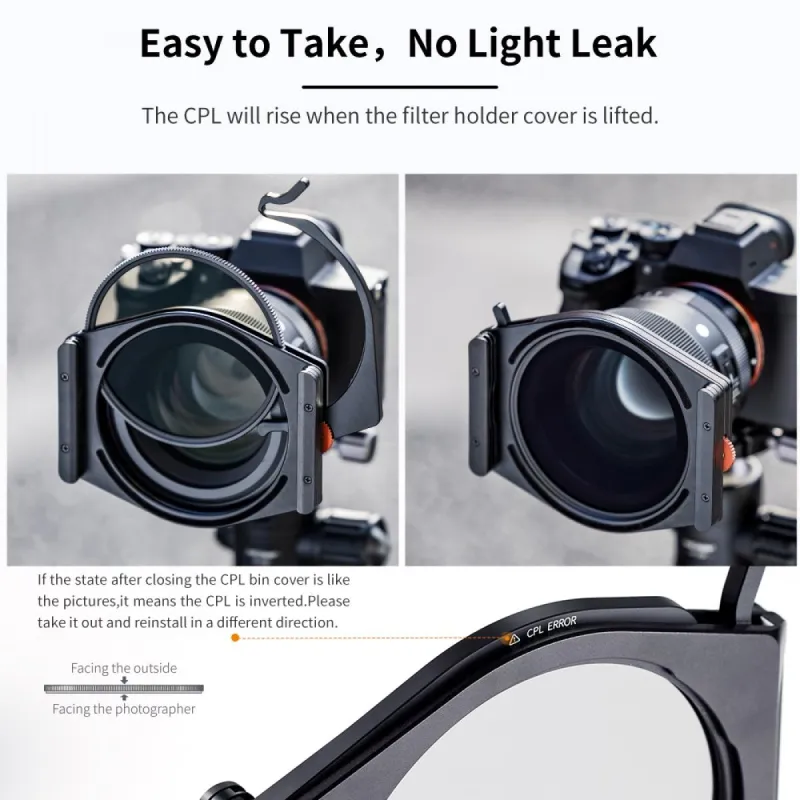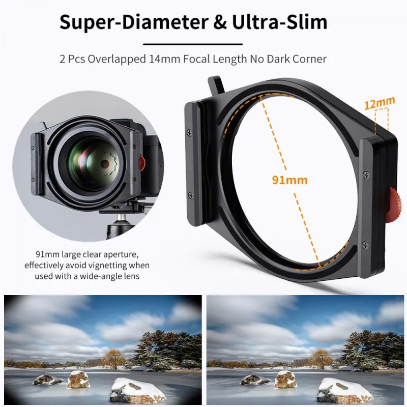 Kit Includes Filter holder + ND8 filter(3-Stop) +ND64 filter(6-Stop) + ND1000 filter(10-Stop)+ CPL filter +4 * adapter rings(67mm/72mm/77mm/82mm)+ Leather filter pounches.Original Design-Super-Diameter & Ultra-Slim. K&F Concept Pro Square Filter System won the iF DESIGN AWARD and Red Dot Design Award. The filter holder can hold both CPL and nd1000 filters. Holder thickness 12mm, 91mm large clear aperture. Effectively reduce the chance of vignetting when using an ultra-wide-angle lens. ultra-slim frame and large diameter ensure no vignetting on a wide-angle lens, rear CPL design for convenient install and removal.