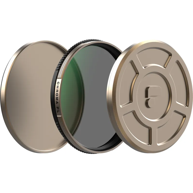 The filter canister mimics the appearance of classic film reels and includes a quick Sunny 16 Rule cheat sheet for easy exposure adjustments in various lighting conditions. The Chroma CPL filter effectively reduces reflections, enhancing contrast and color depth in your images.