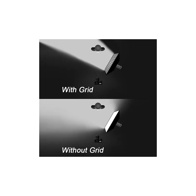 The LHC-36K Honeycomb panel from Falcon Eyes is a professional solution for making light softer and steering at a certain angle. The diffuse cloth makes the light softer and the grid provides control at a small angle. This way you have full control over the light and it will not spread widely. On the last image you can see what effect this has. The frame of the LHC-36K is no less than 360 x 360 cm. You can also use the LHC-36K without a grid, leaving only the diffusion cloth. This makes the light spread wider and softer.