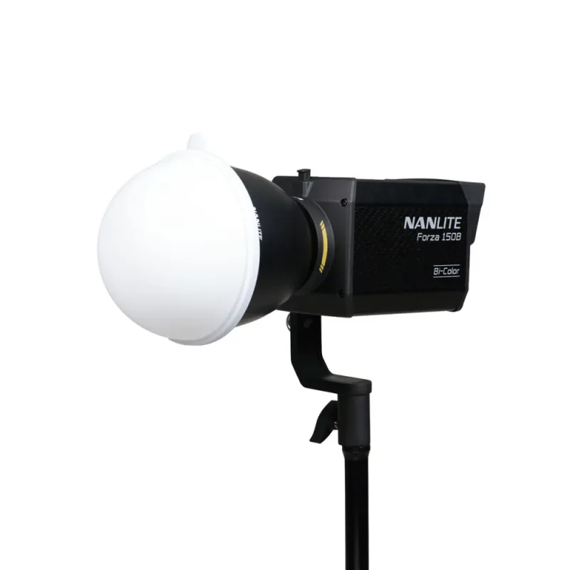 The diffusion dome is designed for the RF-FMM-45 FM mount reflector 45. The RF-FMM-45 reflector is compatible with FM mount fixtures including FC-60B/120B, Forza 60 II/60B II/60C/150/150B, and FS-60B. It is a compact and lightweight accessory that can be easily attached to the front of the reflector, providing a simple and cost-effective solution for portrait lighting and catchlights.