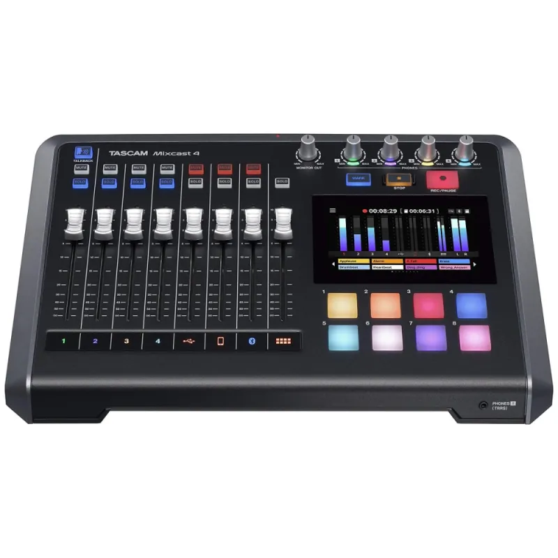 From audio recording to the mixing of recorded audio, the Mixcast 4 offers a complete production environment with multiple convenient functions such as 14-track recording direct to the unit’s SD card, Bluetooth audio input, an Aux input connector to easily mix and record phone conversations (with mix-minus) or other sound sources, and USB connectivity that allows the unit to add sounds from a computer.