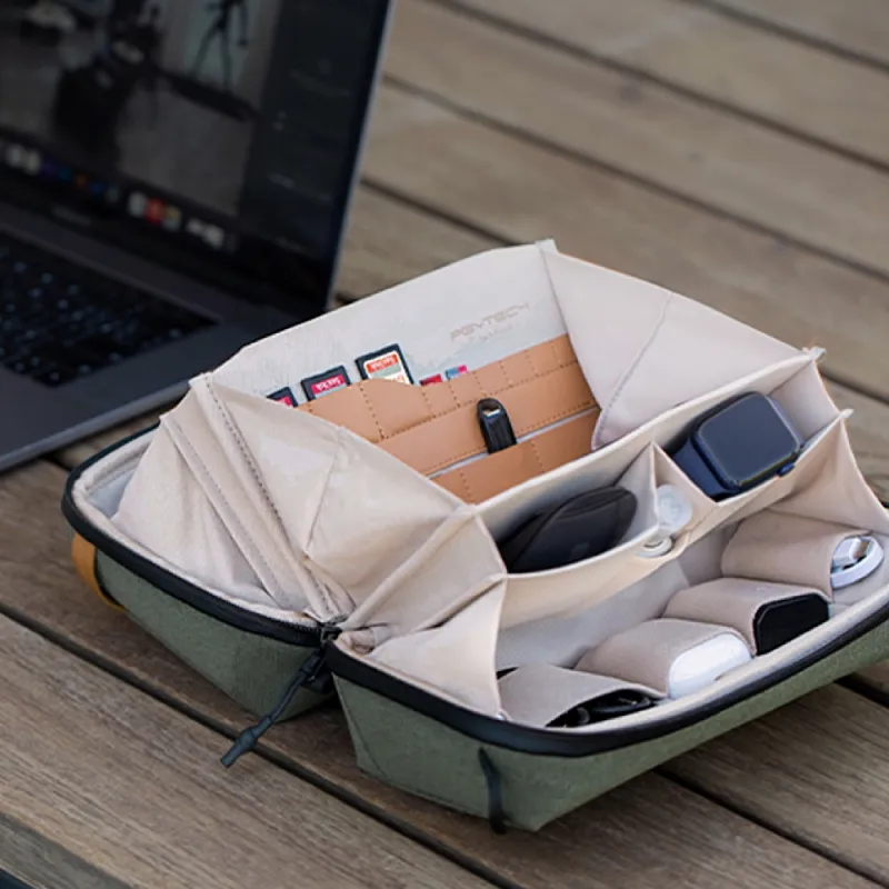 Make it easy to store your accessories, organize them properly and be sure to always find what you need without any problems. PGYTECH case is equipped with plenty of compartments and pockets where you can store, for example, memory cards, computer mouse, powerbank, watch and necessary cables. There's also a separate space for your pen and bank cards, as well as a hidden pocket for your AirTag.