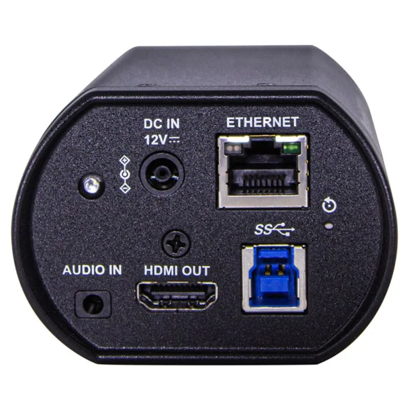 With zoom and free navigation on the horizontal and vertical axis, the CV420e workflow is similar to a PTZ camera. The integrated 4.5mm lens captures a wide image area. Via the digital zoom, dynamic recordings in Full HD are possible. In addition to the manual selection of the image section, up to 250 presets can be controlled. Operation is possible via the web interface, external software such as OBS and vMix, as well as the included IR remote control.
