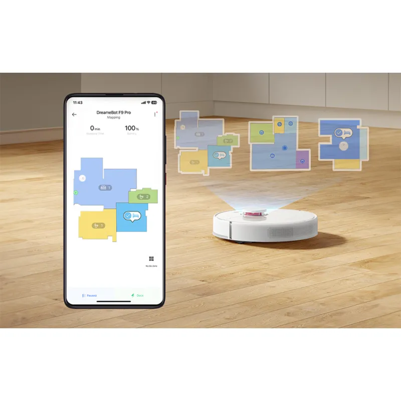 Dreame F9 Pro yra aprūpintas tikslią LiDAR navigacija, kuri skenuoja patalpas ir kuria redaguojamus žemėlapius su vidinėmis detalėmis, nustatydama efektyviausius valymo kelius tiksliam valymui ir manevravimui tarp patalpų. Robotas gali įveikti slenksčius iki 2cm aukščio. Dėl redagavimo galimybių galite padalinti patalpas į segmentus, nustatyti draudžiamas zonas, planuoti valymo sesijas ir dar daugiau.