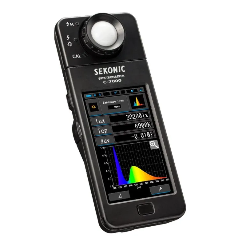 Utilizing Sekonic’s CMOS linear image sensor design and large touch-screen color display, the C-7000 can measure and accurately describe LED, HMI, fluorescent, as well as natural light and electronic flash.